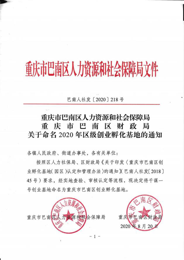 【正式命名】千谋一号创业基地正式命名为 重庆市巴南区创业孵化基地