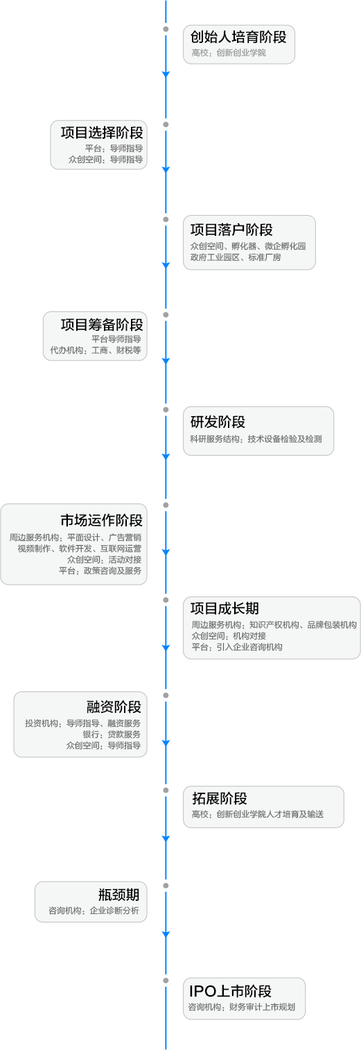 企业全生命周期过程,主要包括创始人培育、项目选择、项目选址、项目筹备、市场运作、融资阶段、拓展期、研发、企业瓶颈、IPO上市十个环节。